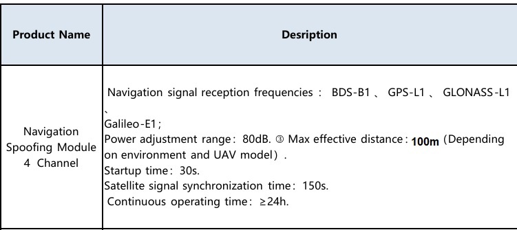 The jammer can jam any commercial satelite navigation frequencies, across all (GPS, GLONAS, Galileo, BeiDou, etc) satelite constellations (GNSS). The Jammer can jam UAV radio bands as well as GNSS bands.